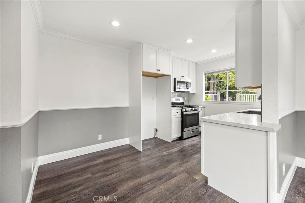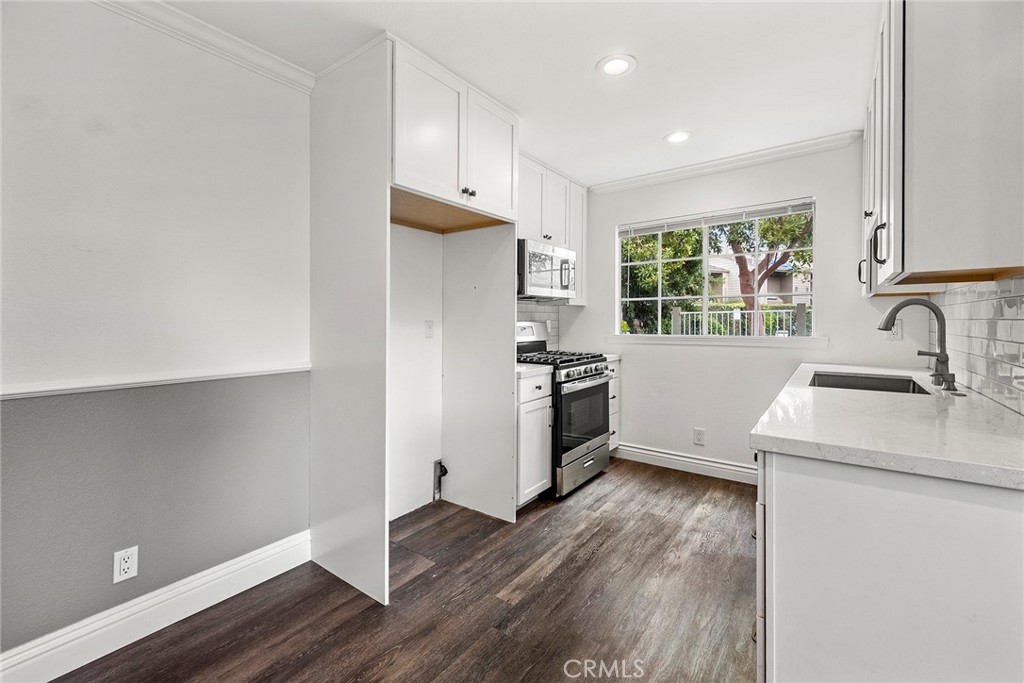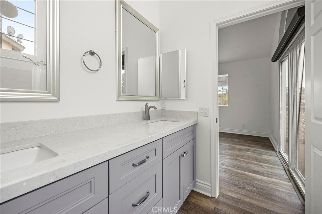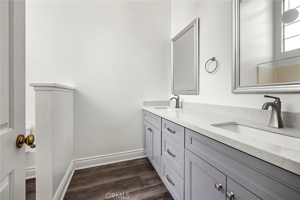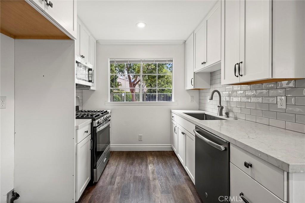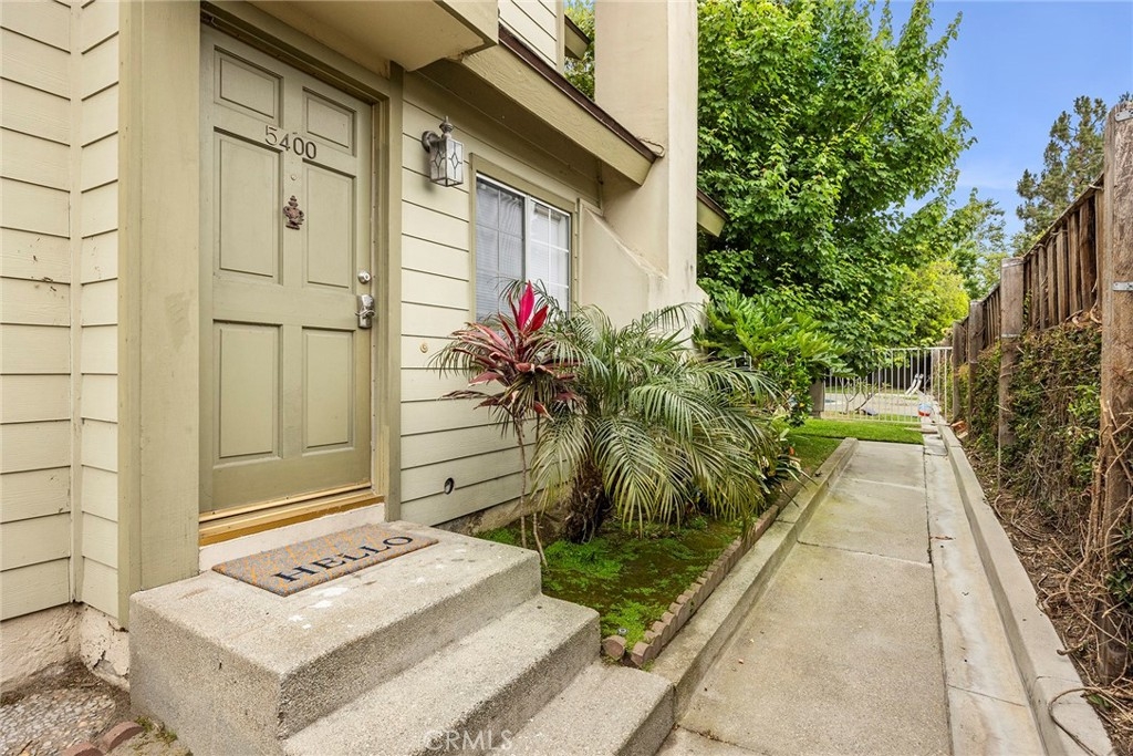 Tucked away toward the rear of this charming, 16-unit complex is 5400 Brittany Way – an end unit just steps from the community pool and manicured greenbelt. The property enjoys many upgrades throughout, including an updated kitchen with quartz countertops, polished ceramic subway tile backsplash, Shaker-style cabinetry, stainless steel appliances, recessed lighting, and cordless blinds on the west-facing window. Wood-look vinyl flooring rounds out the downstairs, as well as a custom two-tone paint scheme, living room fireplace with neutral tile surround, dining nook, and glass slider to the outdoors. The lower-level powder room has been tastefully renovated with a modern, floating vanity and coordinating wall cabinet, and is adjacent to the two-car attached garage with direct access. Upstairs, a convenient second-level laundry closet with built-in storage sits between dual owners’ suites. The west bedroom offers an oversized closet and a private full bathroom with tile flooring, single vanity, and tub/shower combo. The east bedroom features another oversized closet, private balcony, and bathroom with loads of natural light, sleek, updated double vanity with quartz counters, metallic accents and fixtures, plus tub/shower combo. The community of Cambridge Commons is close to schools, dining, shopping, and entertainment, and is just minutes away from multiple freeways and theme parks.
