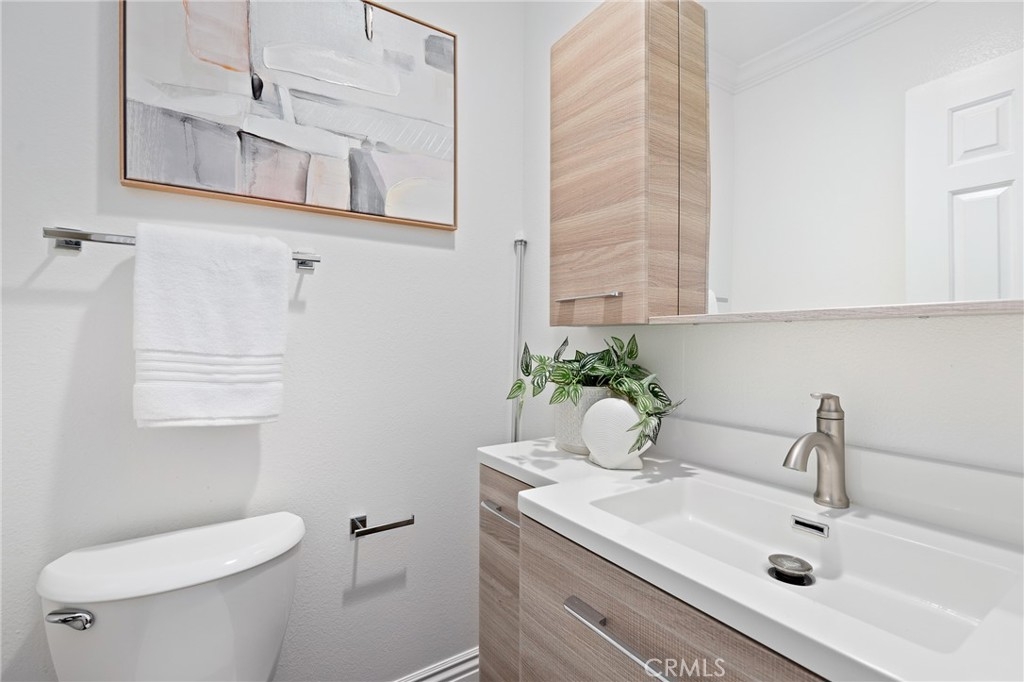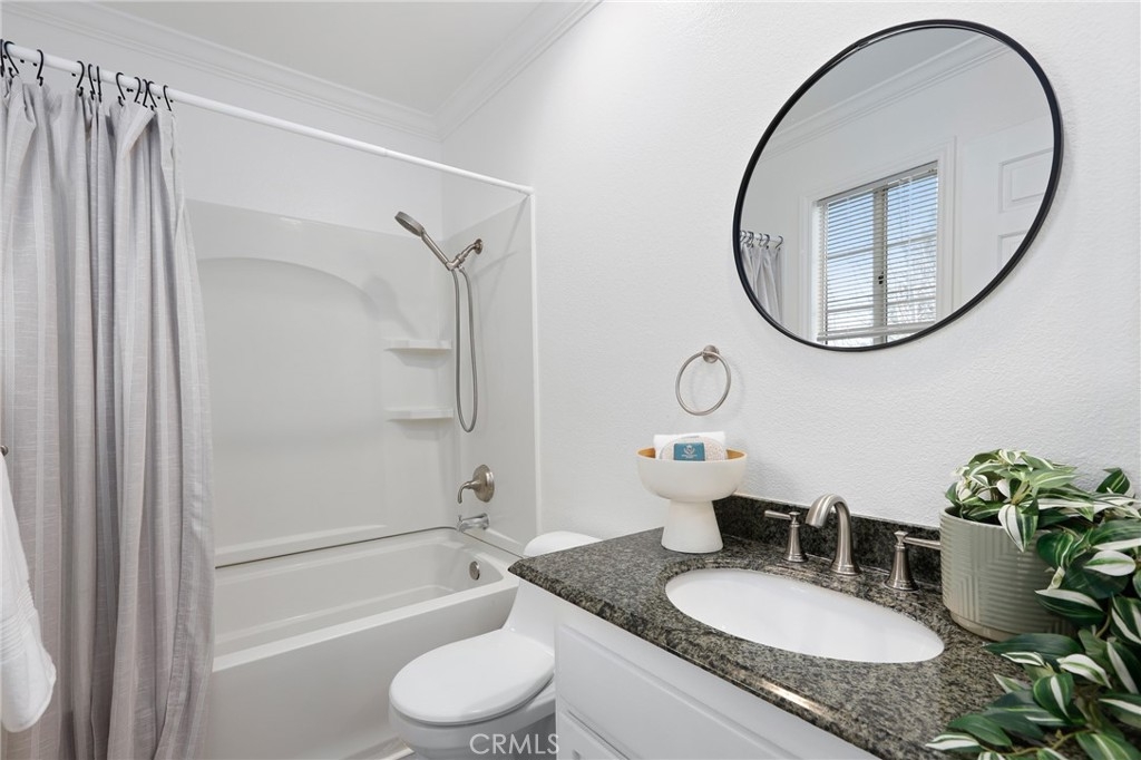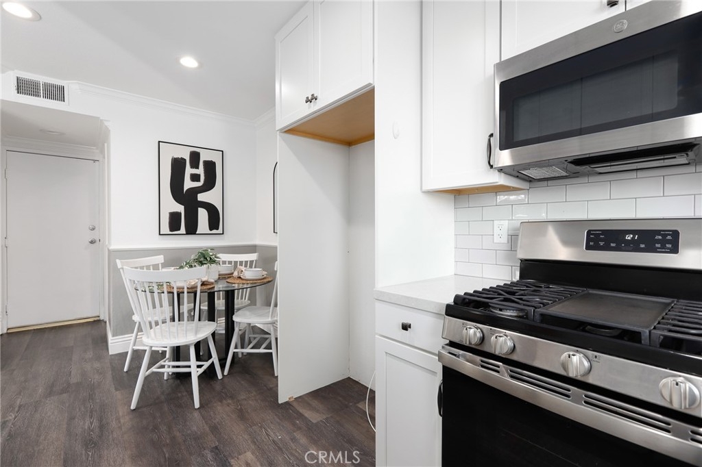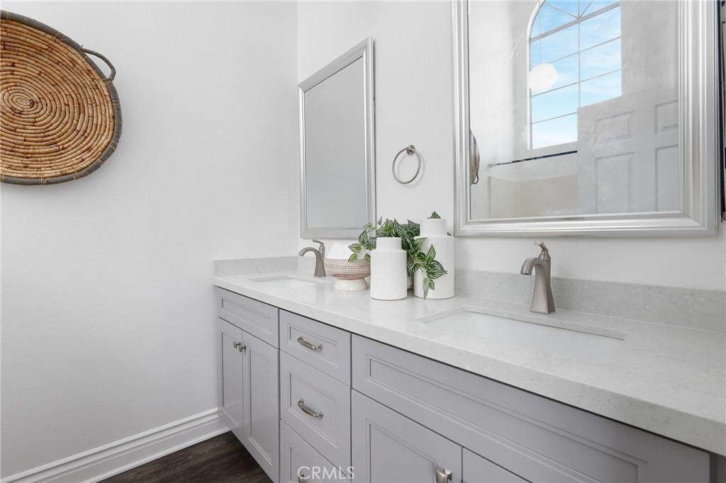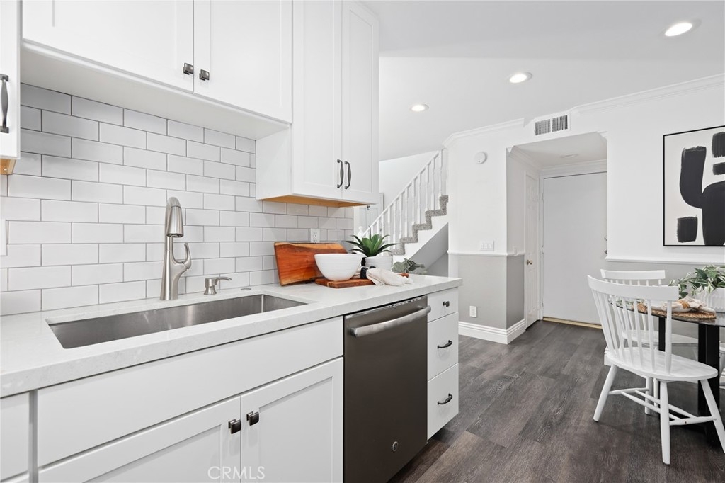 This charming 2-story condo in the peaceful Cambridge Commons community offers a prime location at the back of a 16-unit complex, with views of the lush greenbelt and community pool. Recently updated, this 2-bedroom, 2.5-bathroom home features luxury vinyl flooring on the main level, a stylish two-tone paint scheme, a cozy fireplace, and a sliding door to the outdoors. The remodeled kitchen boasts white shaker cabinets, subway tile backsplash, stainless steel appliances, and recessed lighting. The main-level powder bath is modernized with a floating vanity and coordinating wall cabinet, and located next to the attached two-car garage with direct access. Upstairs, find a hallway laundry closet with built-in storage, positioned between two spacious primary suites. The first suite includes vaulted ceilings, an oversized closet, and an en suite bathroom with tile floors and a tub/shower combo. The second suite also offers high ceilings, mirrored closet doors, a private balcony, and an en suite bathroom with an updated double vanity and quartz countertops. The community is ideally located near shopping, parks, and schools, including Walker Jr High, Kennedy High School, and Oxford Academy. Welcome home!