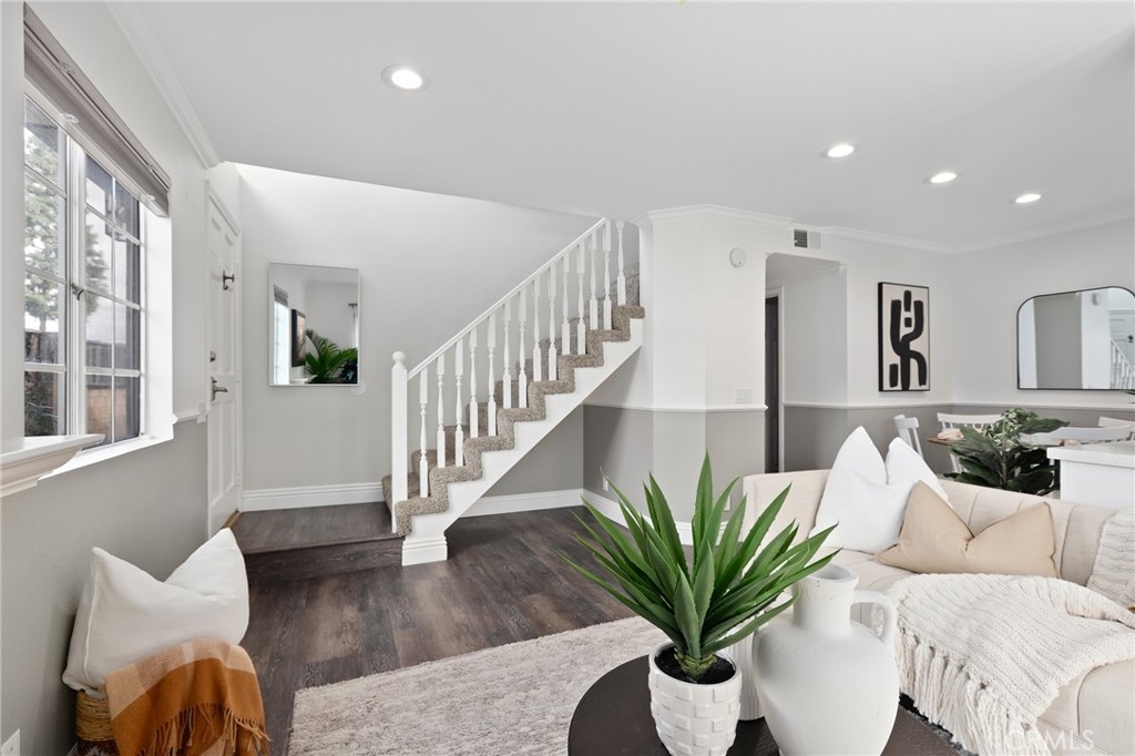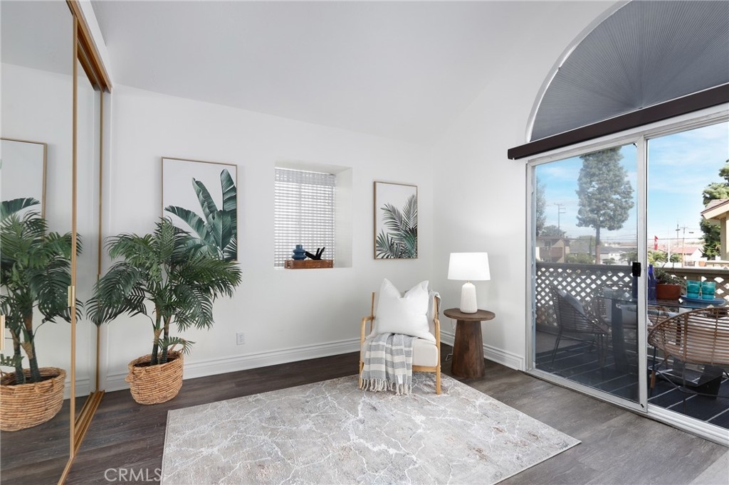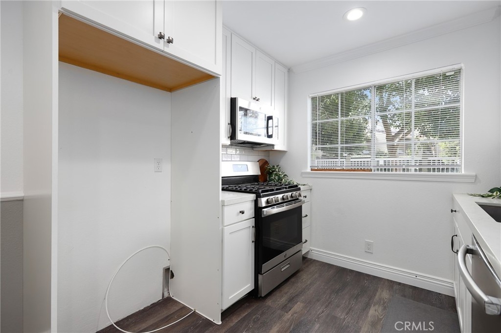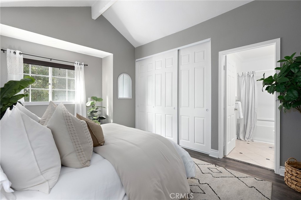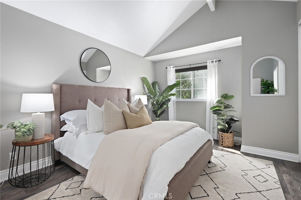 This charming 2-story condo in the peaceful Cambridge Commons community offers a prime location at the back of a 16-unit complex, with views of the lush greenbelt and community pool. Recently updated, this 2-bedroom, 2.5-bathroom home features luxury vinyl flooring on the main level, a stylish two-tone paint scheme, a cozy fireplace, and a sliding door to the outdoors. The remodeled kitchen boasts white shaker cabinets, subway tile backsplash, stainless steel appliances, and recessed lighting. The main-level powder bath is modernized with a floating vanity and coordinating wall cabinet, and located next to the attached two-car garage with direct access. Upstairs, find a hallway laundry closet with built-in storage, positioned between two spacious primary suites. The first suite includes vaulted ceilings, an oversized closet, and an en suite bathroom with tile floors and a tub/shower combo. The second suite also offers high ceilings, mirrored closet doors, a private balcony, and an en suite bathroom with an updated double vanity and quartz countertops. The community is ideally located near shopping, parks, and schools, including Walker Jr High, Kennedy High School, and Oxford Academy. Welcome home!