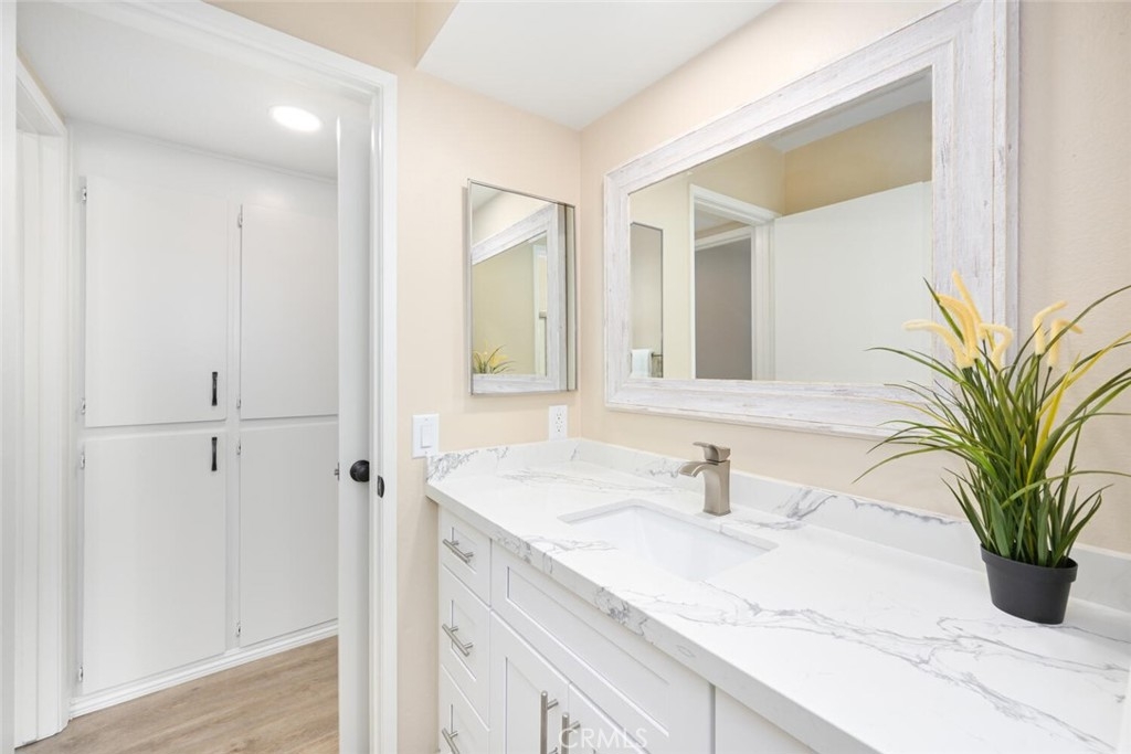 You have arrived at the gated community of Cypress Monterey, a wonderful development with 8 pools, 8 spas, and lighted tennis courts. This townhouse is beautifully upgraded with new durable laminate flooring, finished ceilings with recessed lighting, freshly painted, and is move-in ready. Included is central heating and air-conditioning and dual-pane windows to keep a comfortable temperature. The substantial living space in a neutral color palette, accented with plantation shutters, is awaiting your personal touches. Kitchen highlights well-maintained oak cabinetry with pull-out pots/pan drawers, range, microwave, and a new dishwasher, all surrounded with new quartz countertops. Everyday dining area in kitchen and space in living room for additional dining options. Pamper yourself in the remodeled bathroom vanity area with privacy door to bathroom/shower needs. One sizeable bedroom features two large-mirrored door closets for plenty of wardrobe space. Working from home? Enclosed balcony gains you further space for office, hobby, or whatever suits your needs. The HOA stays on top of exterior maintenance, so you don’t have to. Several pathways to stroll or visit with neighbors. Sore muscles after moving? Relax in one of the pools or spas conveniently located, nearby. Spacious two-car attached garage with direct access and laundry hookups. Guest parking also available. Located in one of the most desirable areas in West Orange County, Cypress Monterey is proximate to top-rated local schools, including Cypress College, CSULB, Cal State Fullerton, parks, shopping, eateries, and transportation.