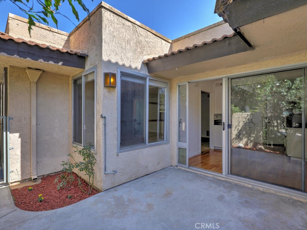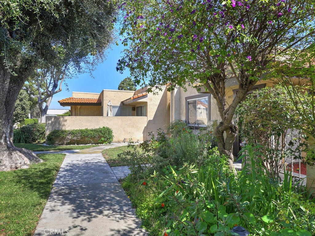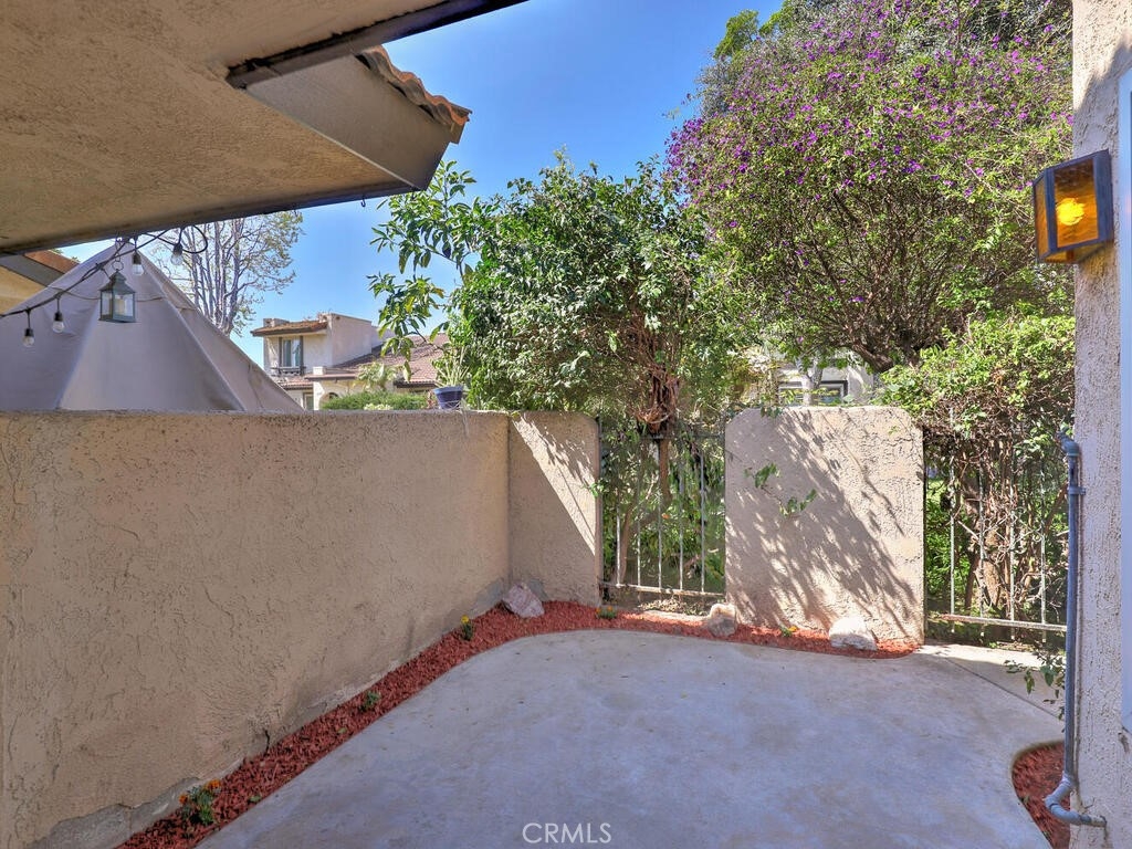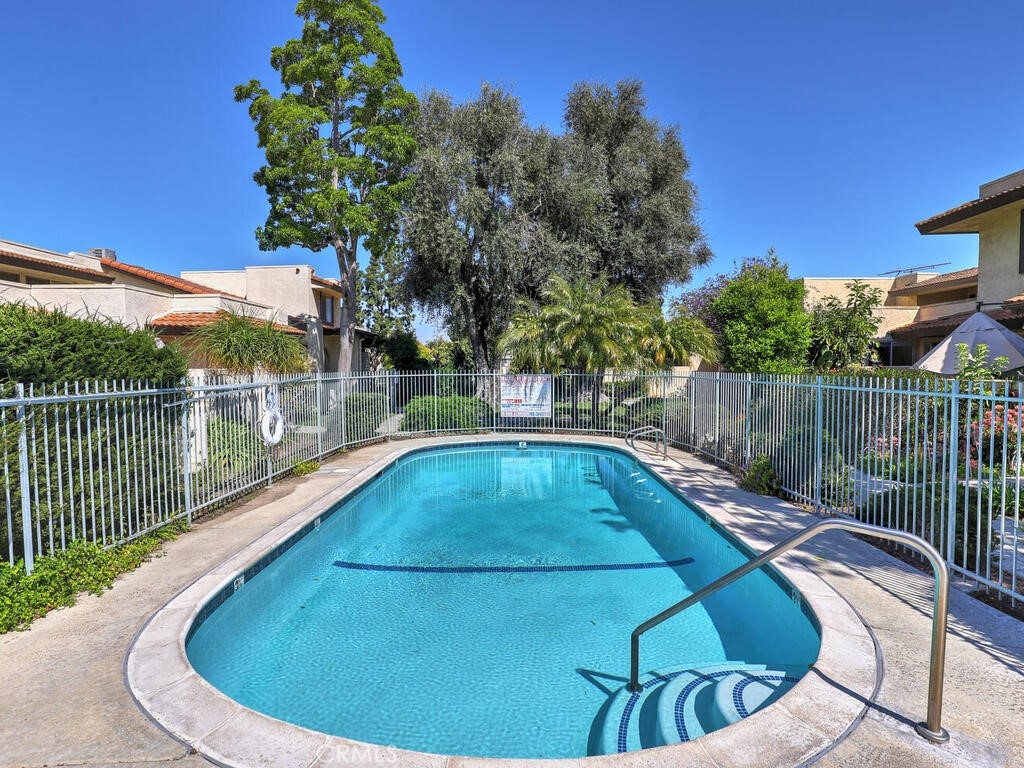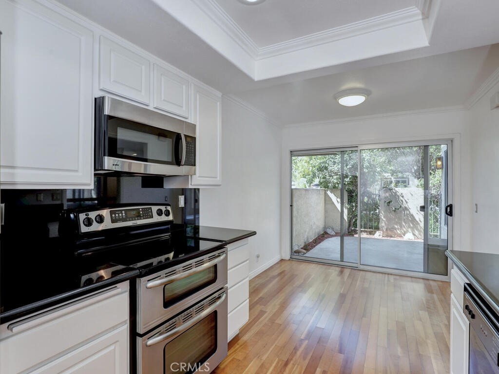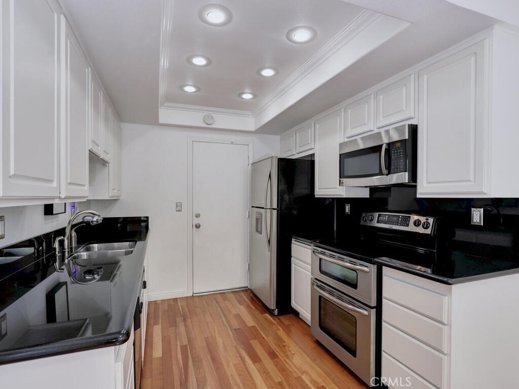 Welcome to this beautifully updated one bedroom condo, nestled in a secure gated community with a call box for added peace of mind. This property boasts brand new interior paint, elegant crown molding throughout, and scraped ceilings, creating a fresh and modern ambiance. The kitchen has been updated; featuring sleek black quartz countertops, a double electric oven with cooktop, an over-the-range microwave, a dishwasher, and a refrigerator. The natural hardwood floors and recessed lighting add warmth and lots of light. Enjoy the comfort of central AC and heating, a custom/sleek security screen door, freshly steam-cleaned carpets in the living room and bedroom, and updated light fixtures throughout. The living room’s custom mirrored wall enhances the sense of space and light. The master bedroom offers a walk-in closet, luxury window coverings with blackout blinds, and an en-suite bathroom complete with updated fixtures, and a custom side shower head sprayers. Step outside to your private patio, accessible through a sliding glass door off the dining area—perfect for relaxing or entertaining. The attached 2-car garage comes equipped with an automatic opener, washer and dryer, and ample storage space and a 40 gallon Bradford White water heater. As part of this desirable community, you’ll have access to multiple HOA pools, jacuzzis, and tennis courts.
