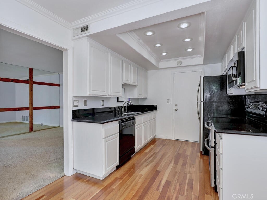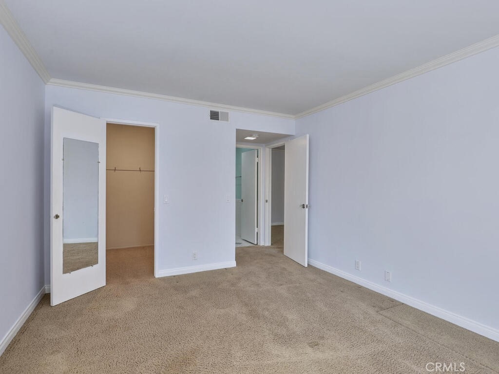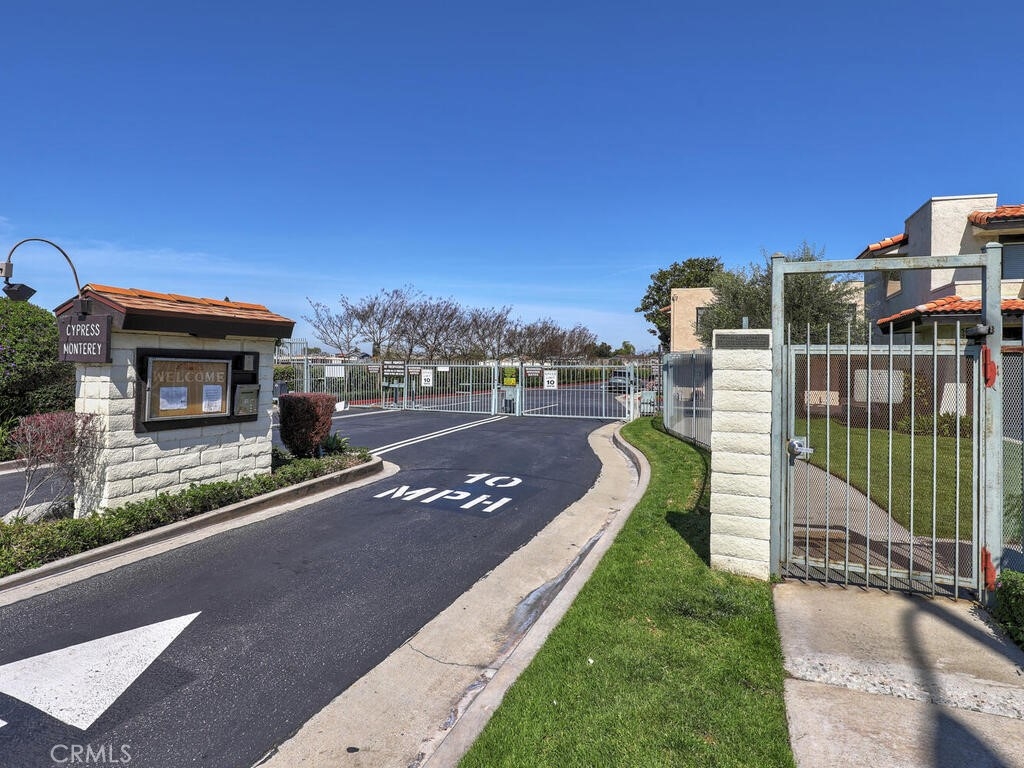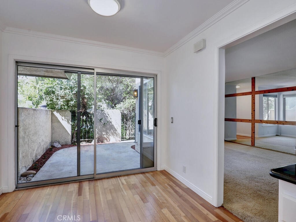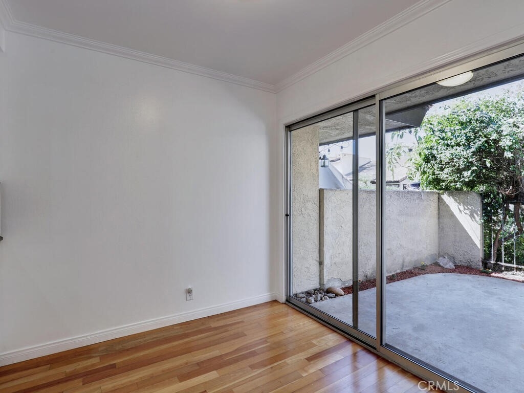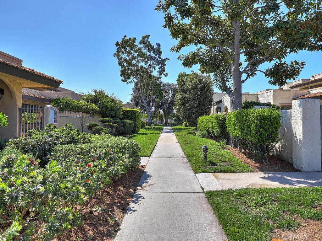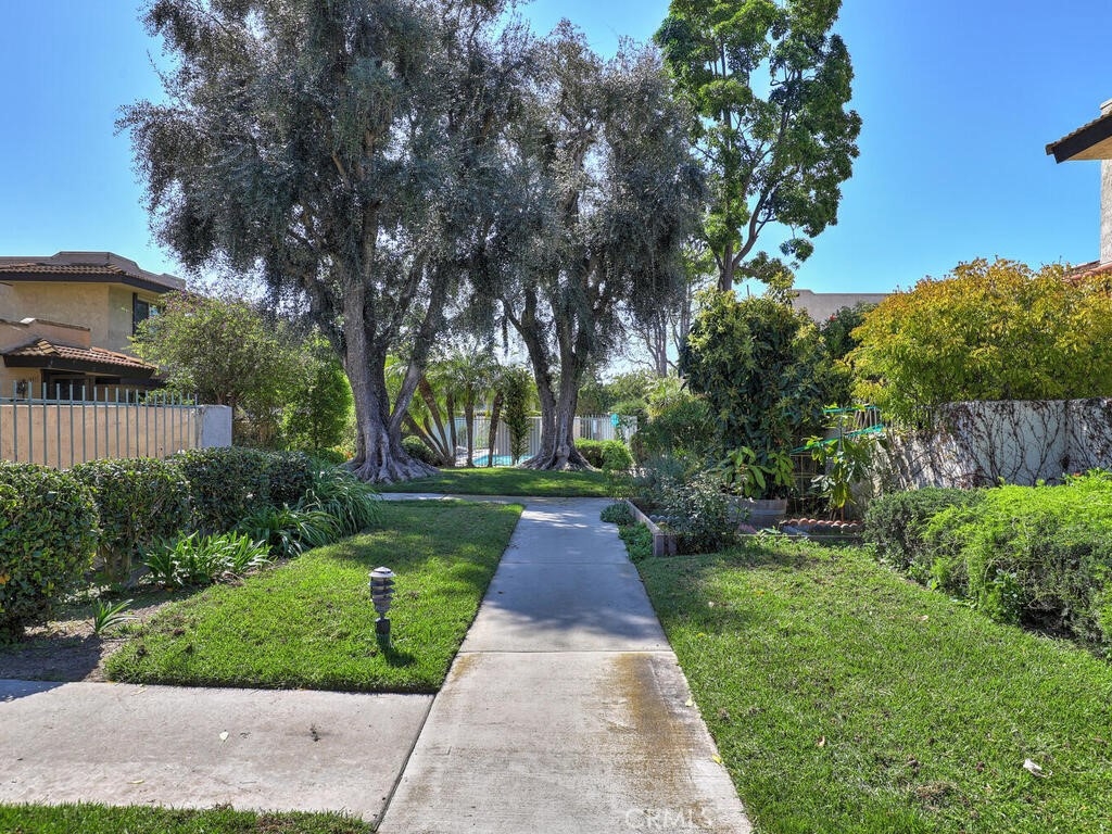 Welcome to this beautifully updated one bedroom condo, nestled in a secure gated community with a call box for added peace of mind. This property boasts brand new interior paint, elegant crown molding throughout, and scraped ceilings, creating a fresh and modern ambiance. The kitchen has been updated; featuring sleek black quartz countertops, a double electric oven with cooktop, an over-the-range microwave, a dishwasher, and a refrigerator. The natural hardwood floors and recessed lighting add warmth and lots of light. Enjoy the comfort of central AC and heating, a custom/sleek security screen door, freshly steam-cleaned carpets in the living room and bedroom, and updated light fixtures throughout. The living room’s custom mirrored wall enhances the sense of space and light. The master bedroom offers a walk-in closet, luxury window coverings with blackout blinds, and an en-suite bathroom complete with updated fixtures, and a custom side shower head sprayers. Step outside to your private patio, accessible through a sliding glass door off the dining area—perfect for relaxing or entertaining. The attached 2-car garage comes equipped with an automatic opener, washer and dryer, and ample storage space and a 40 gallon Bradford White water heater. As part of this desirable community, you’ll have access to multiple HOA pools, jacuzzis, and tennis courts.