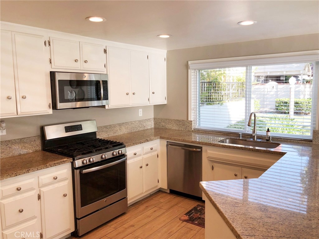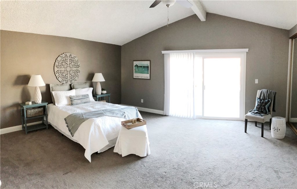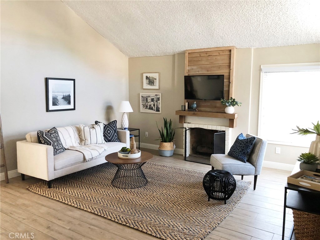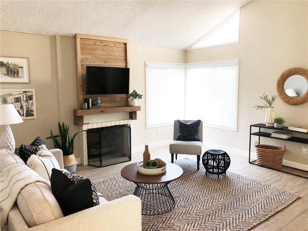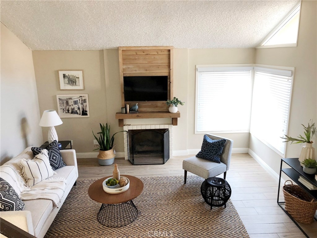 A RARE FIND in Cypress Village. The openness in this 2 story is very inviting. From the entry, is an open floorplan with a large living room including a cathedral ceiling and cozy fireplace. Porcelain tile flooring throughout most of the home is a warm welcoming touch. The gorgeous kitchen with granite counter tops, white cabinetry and peninsula bar is ready for family dining and entertaining. An entire wall of windows offers lots of natural lighting and view of the spacious greenbelt area. Private laundry room, pantry and storage are conveniently located. Completing the downstairs is a bedroom with full closet and an updated bathroom with a shower. Upstairs are 3 more bedrooms, including a huge master suite with triple mirrored wardrobe and 2 upgraded bathrooms. Sliding glass doors lead from the master suite to a large balcony. Amenities include ceiling fans, central air, forced air heating, granite countertops, dual pane windows, recessed lighting, scraped ceilings and more. Cypress Village has low association fees, 3 clubhouses, 3 swimming pools, large spa, tennis courts and beautiful greenbelts and walking paths. Schools are acclaimed Patton Elementary, Bell Intermediate and Pacifica High School. It is close to 405, 22 and 605 freeways, library, shopping and 4 neighborhood parks.