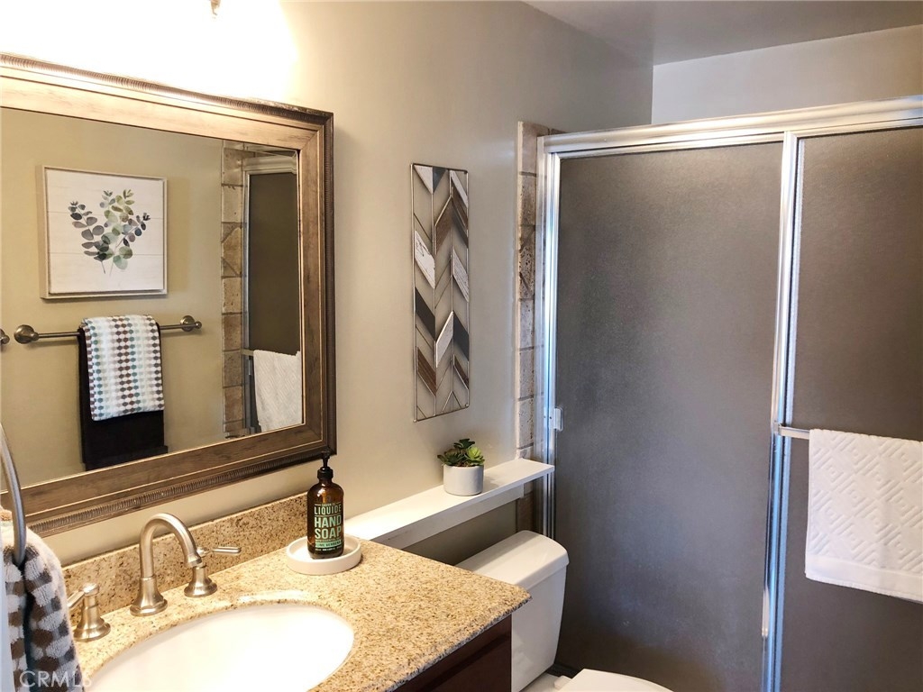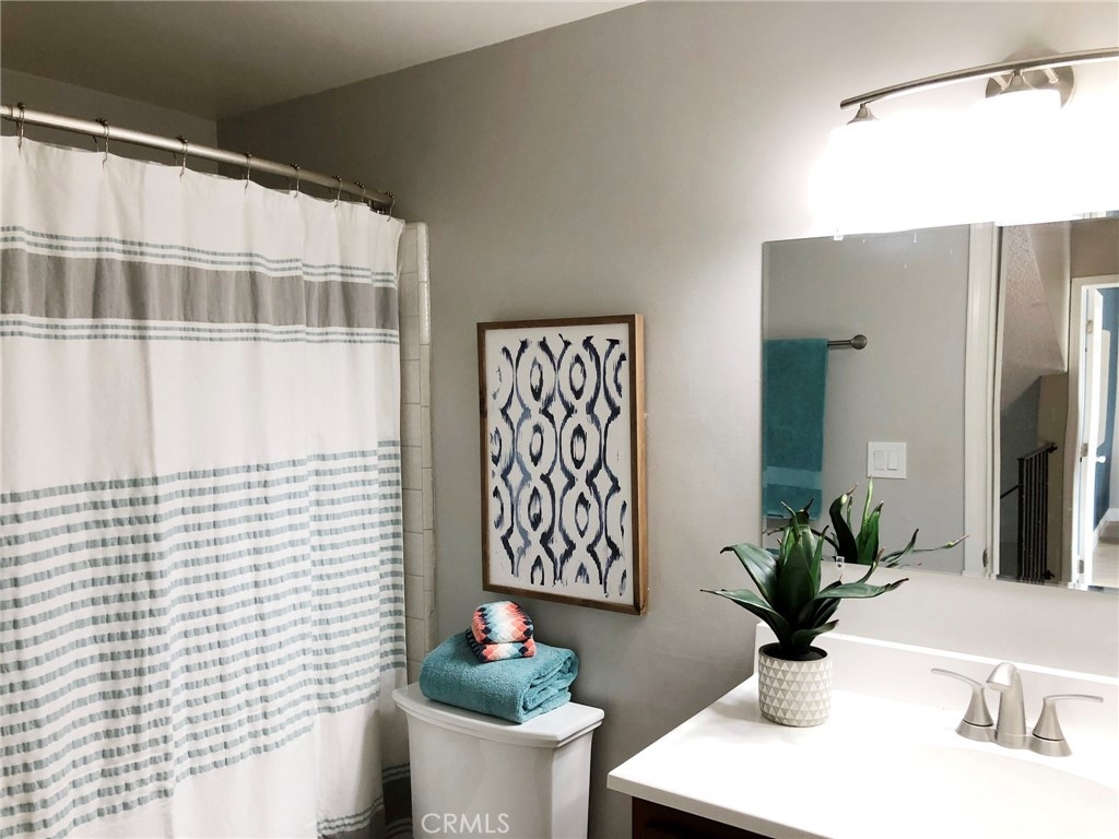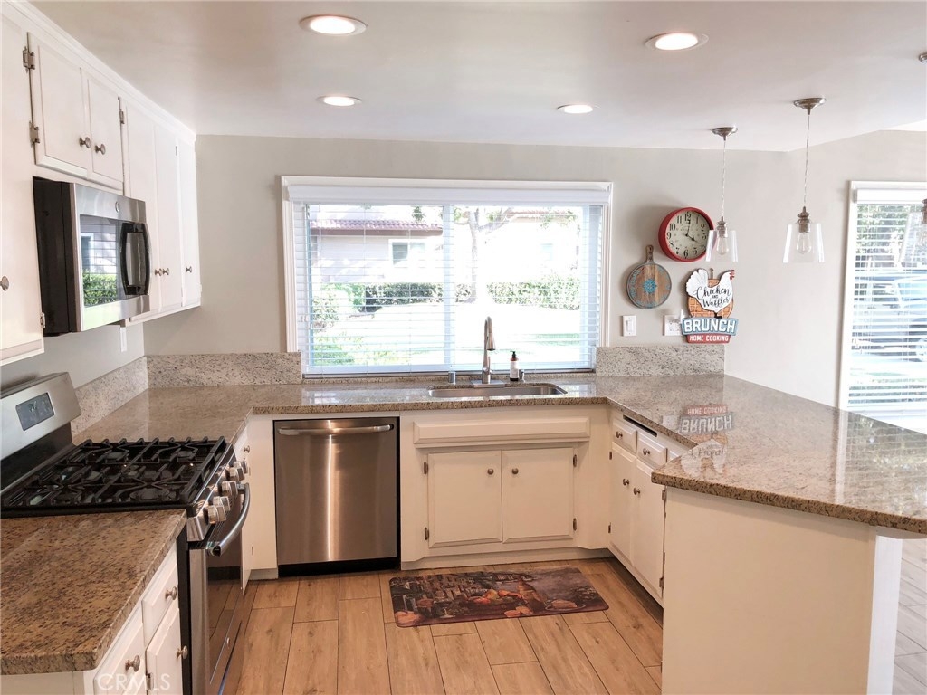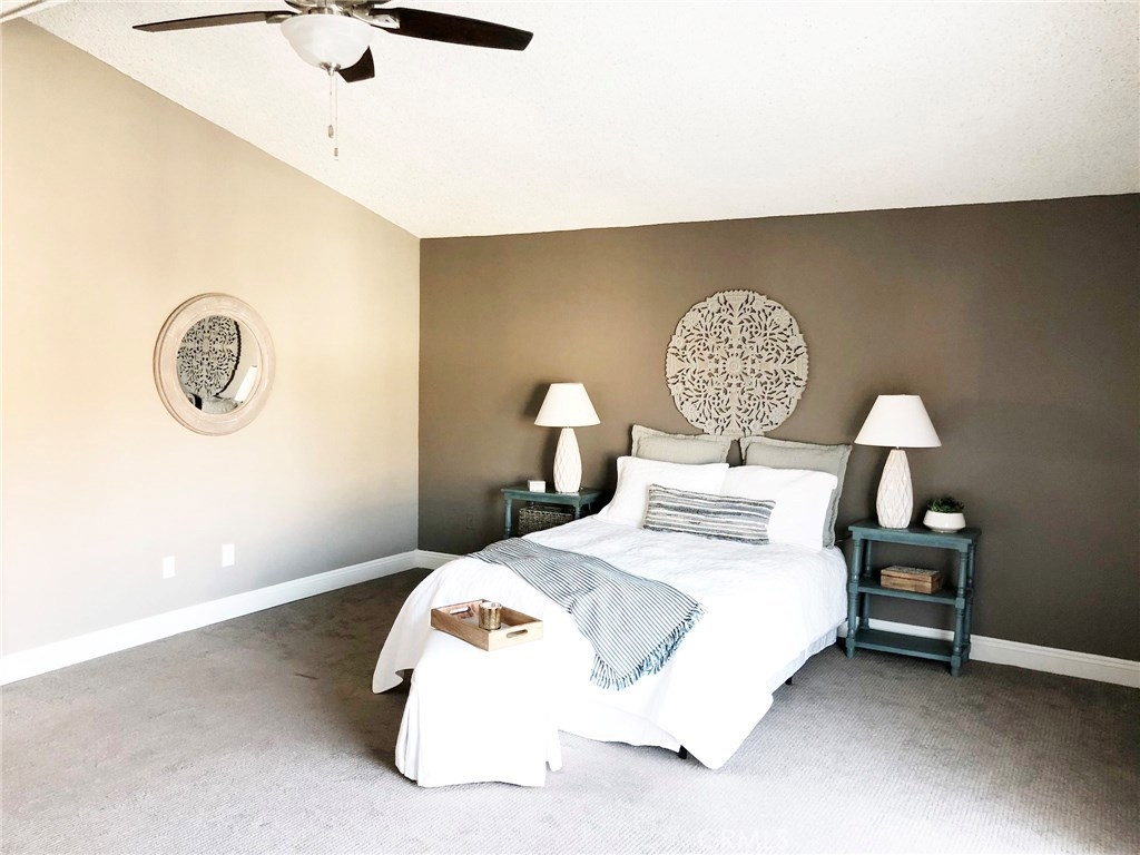 A RARE FIND in Cypress Village. The openness in this 2 story is very inviting. From the entry, is an open floorplan with a large living room including a cathedral ceiling and cozy fireplace. Porcelain tile flooring throughout most of the home is a warm welcoming touch. The gorgeous kitchen with granite counter tops, white cabinetry and peninsula bar is ready for family dining and entertaining. An entire wall of windows offers lots of natural lighting and view of the spacious greenbelt area. Private laundry room, pantry and storage are conveniently located. Completing the downstairs is a bedroom with full closet and an updated bathroom with a shower. Upstairs are 3 more bedrooms, including a huge master suite with triple mirrored wardrobe and 2 upgraded bathrooms. Sliding glass doors lead from the master suite to a large balcony. Amenities include ceiling fans, central air, forced air heating, granite countertops, dual pane windows, recessed lighting, scraped ceilings and more. Cypress Village has low association fees, 3 clubhouses, 3 swimming pools, large spa, tennis courts and beautiful greenbelts and walking paths. Schools are acclaimed Patton Elementary, Bell Intermediate and Pacifica High School. It is close to 405, 22 and 605 freeways, library, shopping and 4 neighborhood parks.