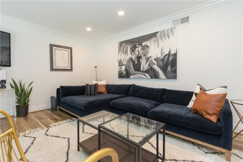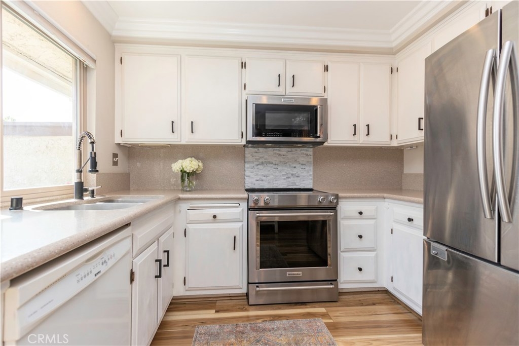 STUNNING 3 BEDROOM 2 BATH SINGLE LEVEL END UNIT home. The sellers anointed this home with MANY DESIGNER UPGRADES to include newer light plank wood laminate flooring T/O, custom crown molding, baseboards, interior doors, double pane windows T/O & recessed lighting. Enjoy a spacious living & dining room area for entertaining and special events with family and friends. The gourmet kitchen offers white cabinets, ample storage, sandstone counters , custom back splash, stainless steel appliances & a convection stove with a slider to your private patio. Elegant master suite offers 2 double wide closets, dimmer lights, slider to the patio. Master bath suite offers dual sink vanity with marble counter, gold facets, designer floors, & custom design marble walk-in shower with bench. There are two additional bedrooms with a full bath that features marble walls, custom vanity and facet! More highlights include: Newer neutral interior paint, scrapped ceilings , inside laundry room & new central air conditioning system! Large private patio has a delightful succulent garden with a lemon tree and direct access to your own 2 car garage. Community offers 3 Pools, 3 Clubhouses, Spa and Tennis courts. Award Winning Blue Ribbon Schools. Shopping , Fwy and beaches close by. Don't miss this exquisite home!