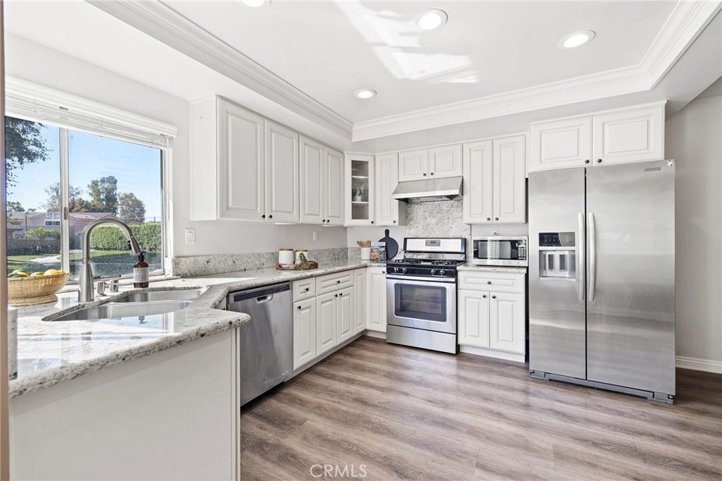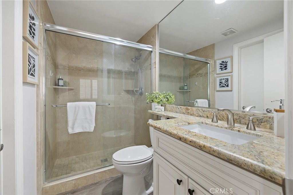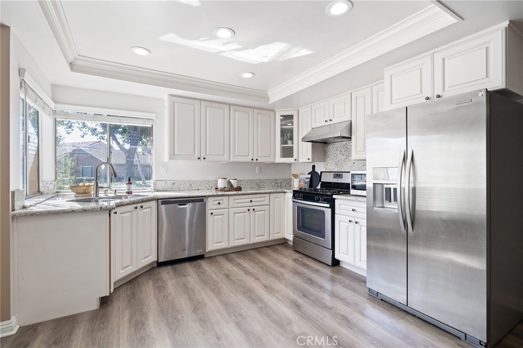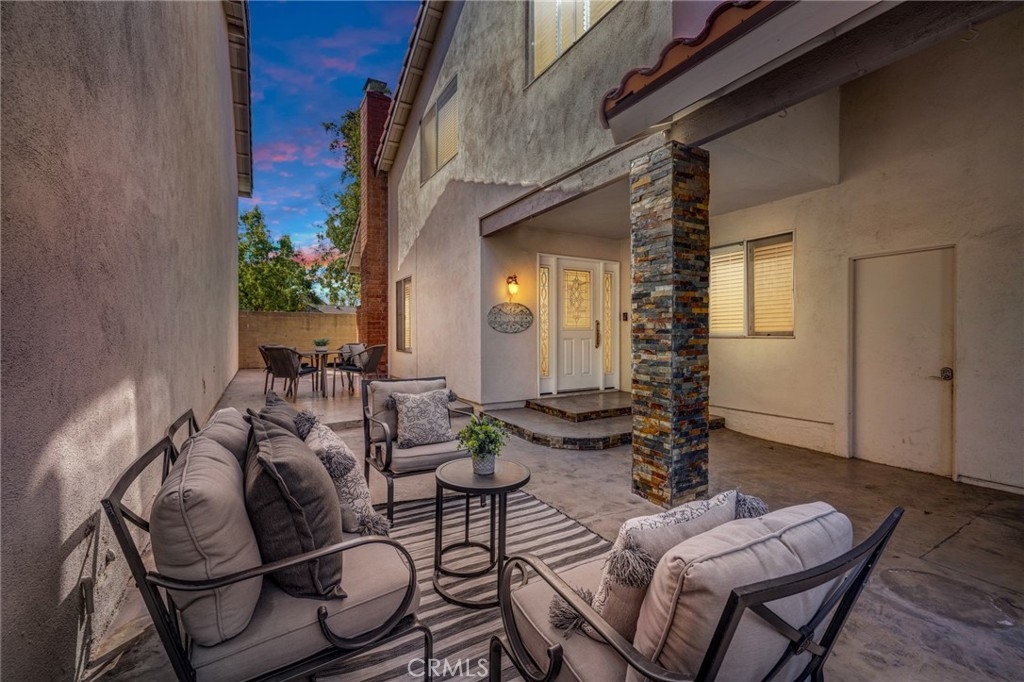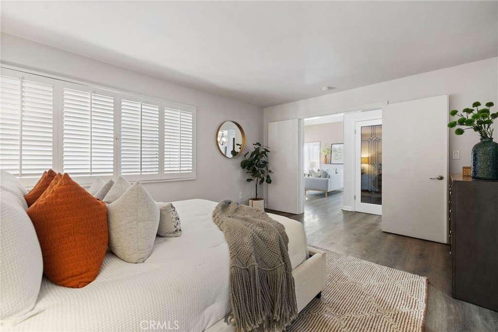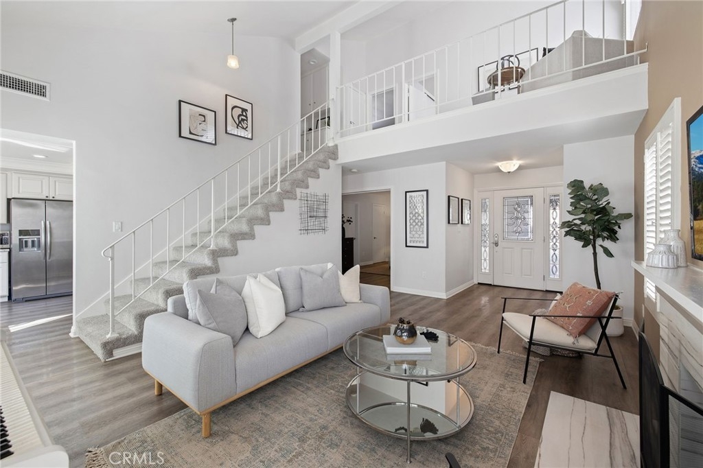 Situated in the desirable community of Cypress Village sits this beautifully remodeled detached home with 3 beds + loft and 2 baths. Upon entry, you'll be greeted by a bright living room with vaulted ceilings, and a modern tiled fireplace. The kitchen has been upgraded with granite counters, a coffered ceiling, recessed lighting, stainless steel appliances, and a smart lock custom wine pantry. The main level master suite is spacious and boasts a walk-in closet and ensuite bathroom. Newer carpet leads up to the second floor loft area with an abundance of natural light, two generously-sized guest bedrooms, a remodeled second bathroom, and large storage area/bonus room. This well-appointed home features a wrought-iron gate entry into your outdoor area with hardscape and turf as well as gated access to one of the communities large greenbelts and tennis courts just behind the home. Additional features include central A/C and heat, plantation shutters, 2-car garage, and close proximity to one of the community pools and spa. Located near top-rated schools, parks, shopping, and dining, this is a must-see home!