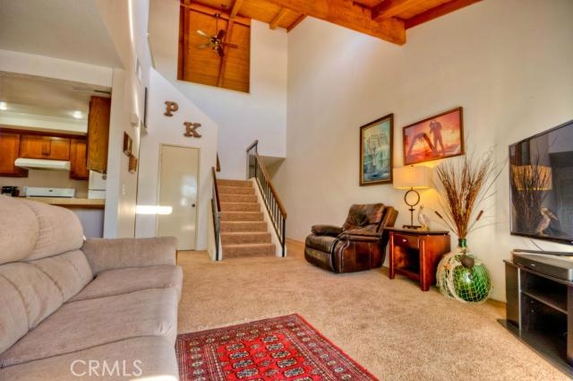 Come see the beautiful 2-story wood beam ceilings! This 2 bedroom, 1.75 bath home is bright and open through out. First floor features open living, dining and kitchen areas. Kitchen has been upgraded with beautiful wood cabinets, granite countertops, wood flooring, and a tray ceiling with crown molding and recessed lighting. Kitchen and dining area separated by tile counter with room for bar stools. Living room features two story ceilings with lots of light from the second floor windows and sliding glass doors to the patio. Make your way upstairs to the master bedroom which features a large walk in closet, tall vaulted ceilings and a large pass through window which keeps the natural light flowing through the property and allows a full view of the home from your bedroom. Master bathroom has built in vanity and mirror with lots of counter space. Second bedroom and bath also upstairs. Make your way outside to the covered patio to enjoy the weather on your beautifully landscaped yard with brick pavers, garden boxes, wood deck, and white lattice decor above the brick and vinyl fencing. The property has a 2 car attached garage with washer/dryer hook ups, driveway space and is right across from the community pool.