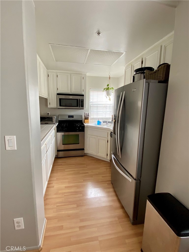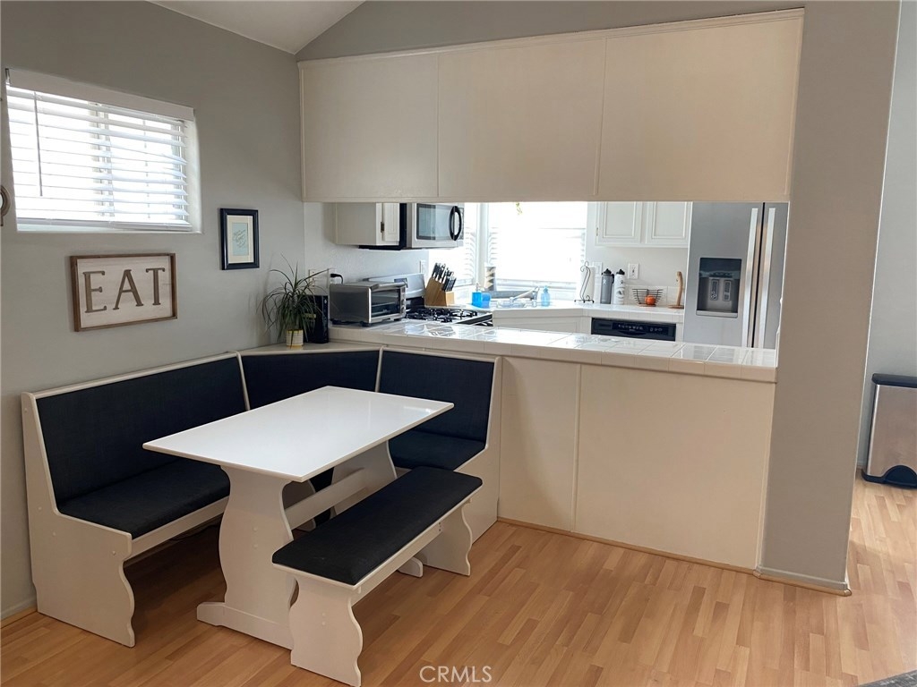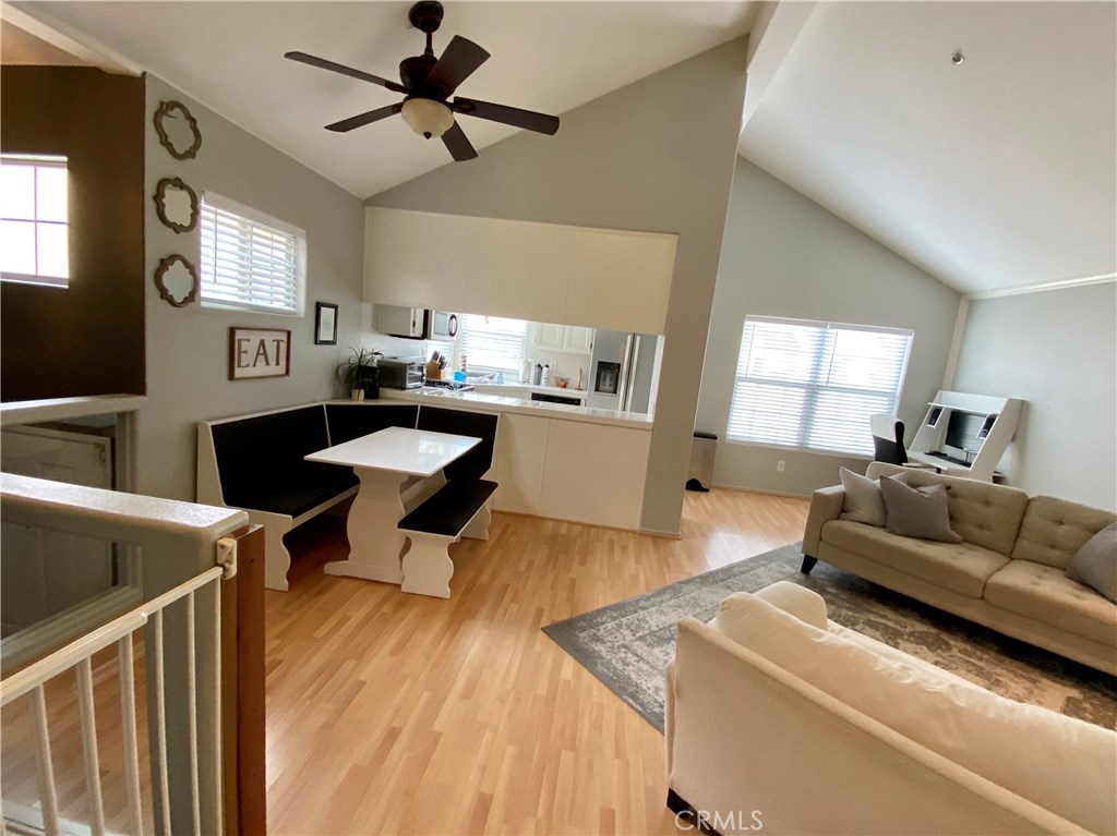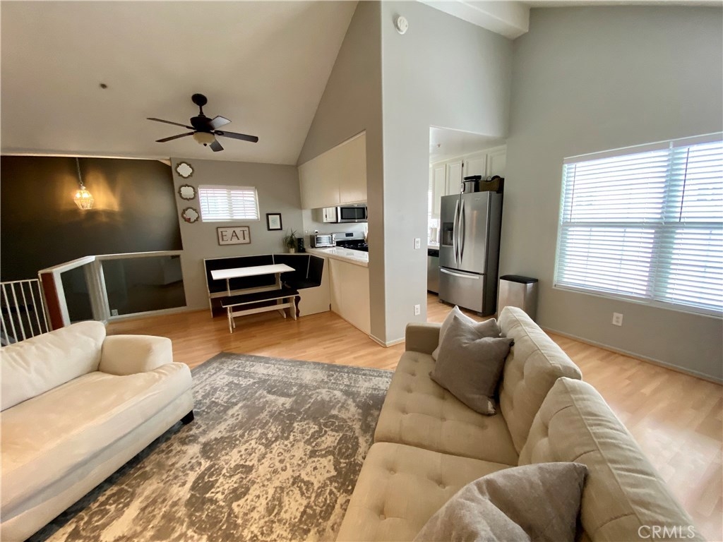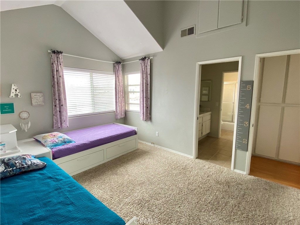 Spacious town home style condo, situated on the border of Cypress and La Palma. Large open living areas with vaulted ceilings, both bedrooms connect to bathrooms, and there's an attached two car garage. While the address is "Moody" a main street, this unit sits snugly off the street in a small quiet complex, where kids can often be found playing and riding bikes care-free of traffic. When entering from the garage, you'll find the first bedroom, bathroom with shower, and entrance to the back patio. Up the stairs, or from the front door, you'll find the open living space that includes the dining area, living room, and kitchen. Here you'll also find the large second bedroom, and full bathroom, complete with a separated 2-sink vanity area.