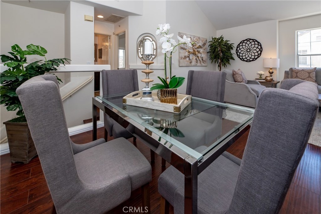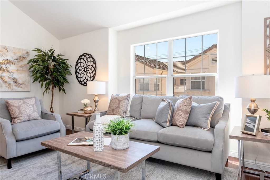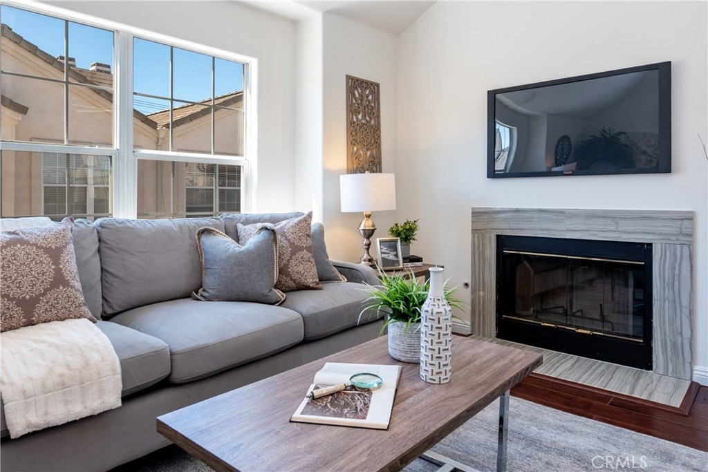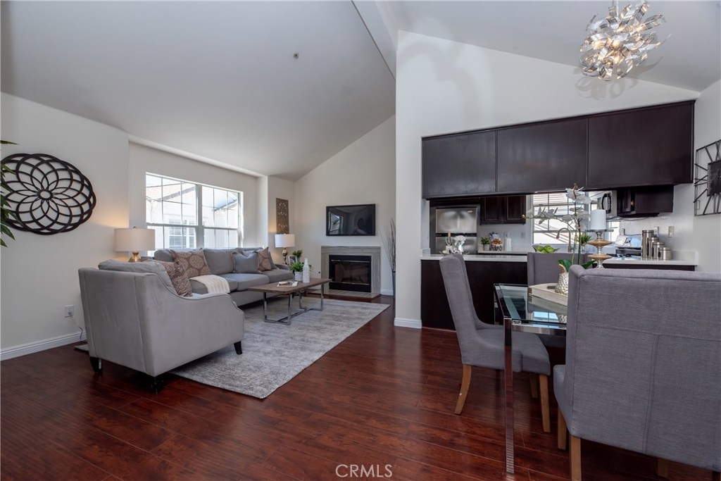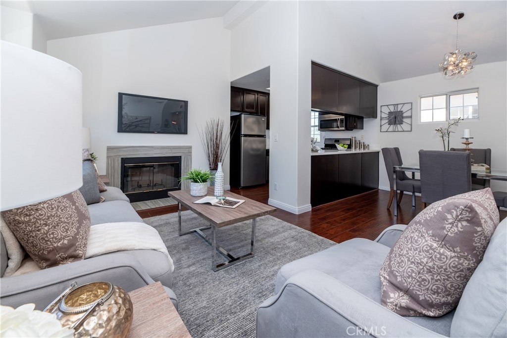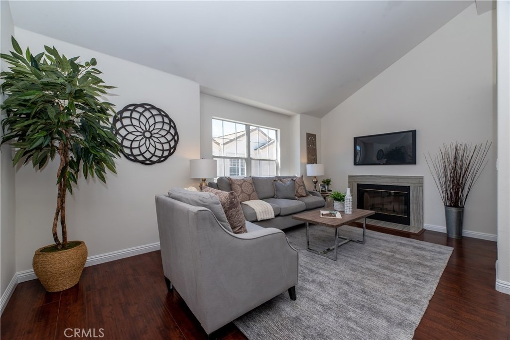 There is an easy elegance with this end unit 2 bed/ 2 bath from the moment you enter this home. Well laid out tiles & laminated wood floors from the entryway, to the stairways & throughout w/ crisp white walls & natural light flooding in, exudes an illusion of space. Clean lines separating all functional space allows for comfort & easy decorating. The combined open living & dining room is anchored by a fireplace w/ tile accent crowned w/lofty ceiling.Bedrooms are on separate floors w/ adjacent full sized bathrooms for function & convenience.Upgraded features include new quartz counter tops in the well lit kitchen & bathrooms,scraped ceilings, newer AC, modern light fixtures,bathroom faucets &much more.A well spaced,nicely decorated & neatly maintained home w/convenient 2 car attached garage.Attends the best schools in the City. Low HOA of $125 monthly.