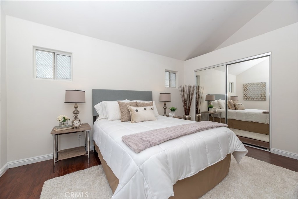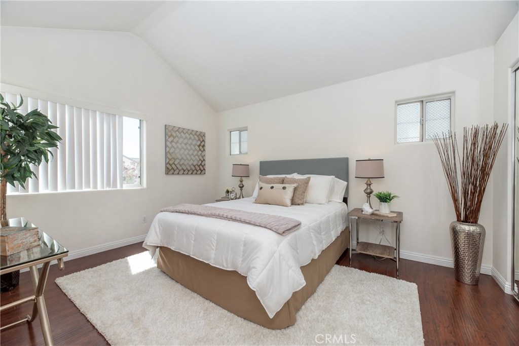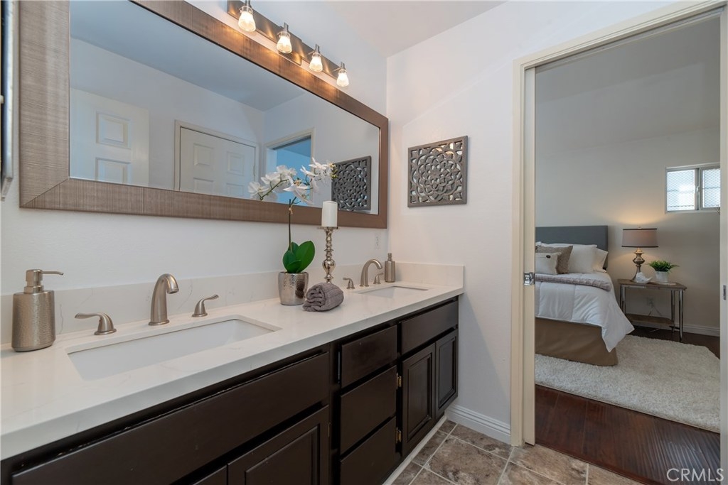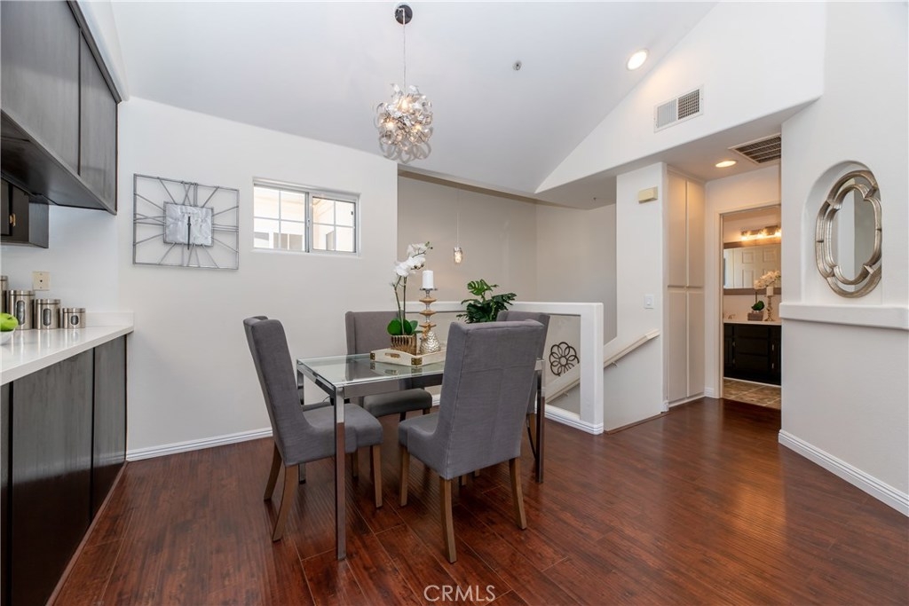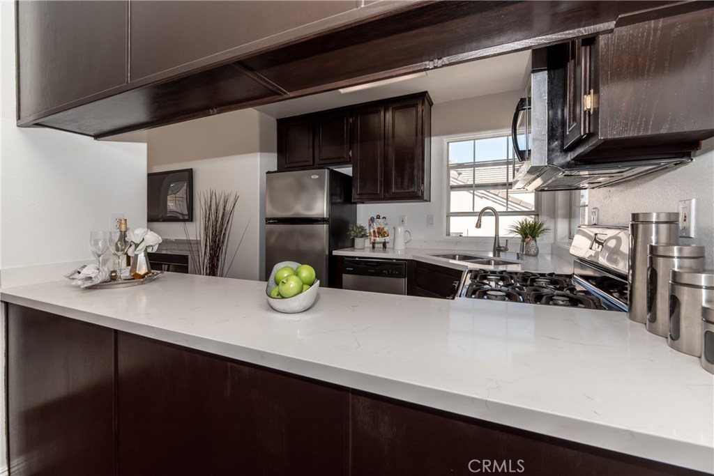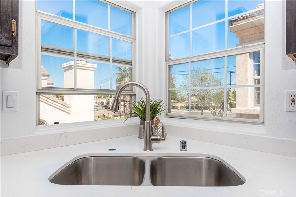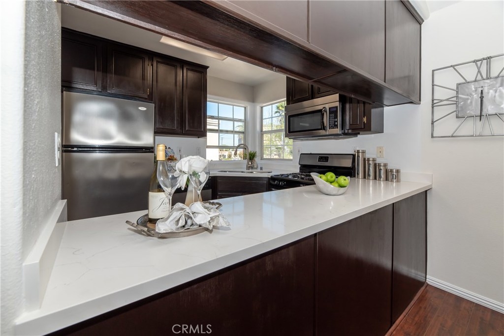 There is an easy elegance with this end unit 2 bed/ 2 bath from the moment you enter this home. Well laid out tiles & laminated wood floors from the entryway, to the stairways & throughout w/ crisp white walls & natural light flooding in, exudes an illusion of space. Clean lines separating all functional space allows for comfort & easy decorating. The combined open living & dining room is anchored by a fireplace w/ tile accent crowned w/lofty ceiling.Bedrooms are on separate floors w/ adjacent full sized bathrooms for function & convenience.Upgraded features include new quartz counter tops in the well lit kitchen & bathrooms,scraped ceilings, newer AC, modern light fixtures,bathroom faucets &much more.A well spaced,nicely decorated & neatly maintained home w/convenient 2 car attached garage.Attends the best schools in the City. Low HOA of $125 monthly.