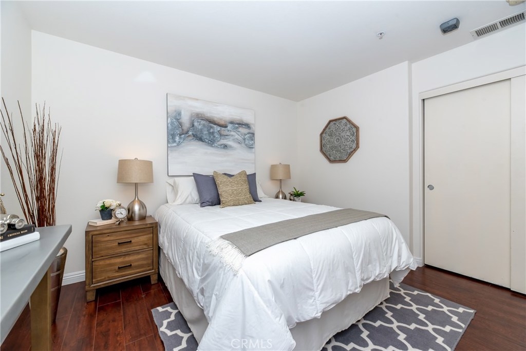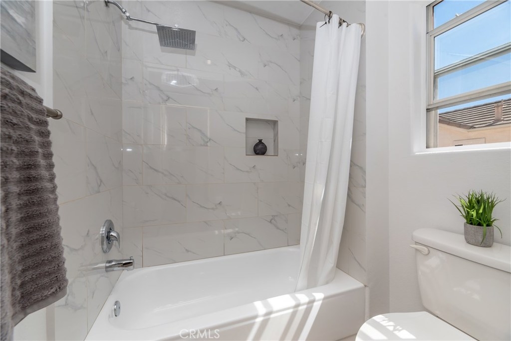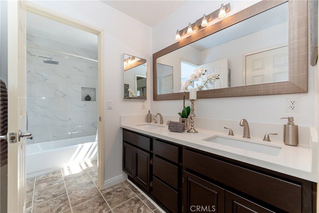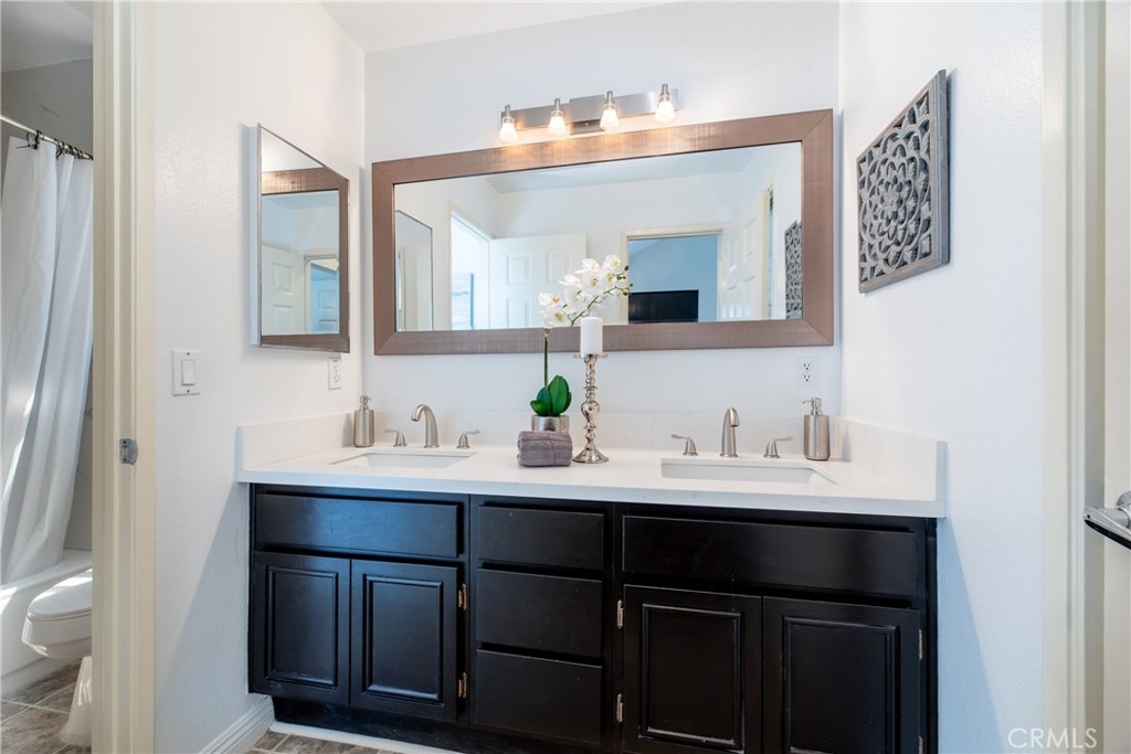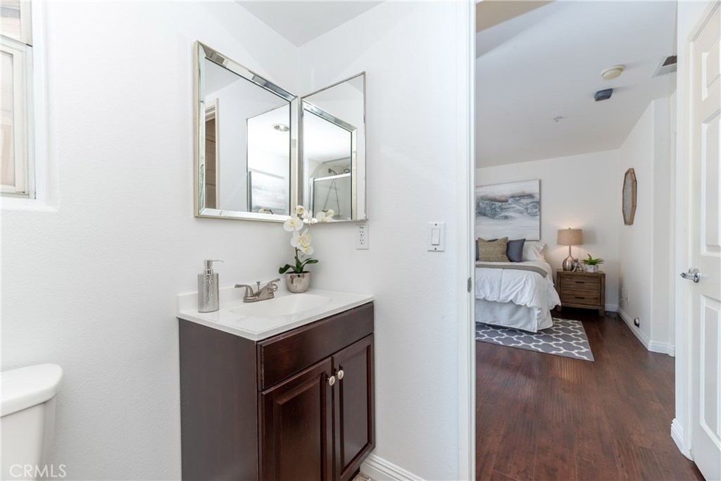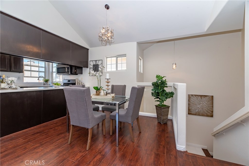There is an easy elegance with this end unit 2 bed/ 2 bath from the moment you enter this home. Well laid out tiles & laminated wood floors from the entryway, to the stairways & throughout w/ crisp white walls & natural light flooding in, exudes an illusion of space. Clean lines separating all functional space allows for comfort & easy decorating. The combined open living & dining room is anchored by a fireplace w/ tile accent crowned w/lofty ceiling.Bedrooms are on separate floors w/ adjacent full sized bathrooms for function & convenience.Upgraded features include new quartz counter tops in the well lit kitchen & bathrooms,scraped ceilings, newer AC, modern light fixtures,bathroom faucets &much more.A well spaced,nicely decorated & neatly maintained home w/convenient 2 car attached garage.Attends the best schools in the City. Low HOA of $125 monthly.