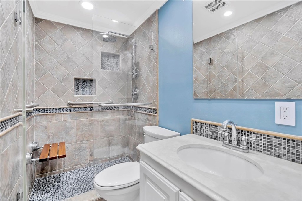 Charming and Much Sought After Single Story End Unit in the Highly Desirable Tanglewood Community. This Attractively Updated 3 Bedroom 2 Bath Home Offers 1056 Square Feet of Living Space. Beautifully Updated Kitchen with Newer Cabinets and Quartz Counter Tops a Large Farm Sink, Under Cabinet Lighting, and the Lower Corner Cabinets have Lazy Susans for Convenient Acess to Additional Storage. The Master Bedroom has Elegant Wainscotting, Mirrored Closet Doors, Ceiling Fan, and its very own Private Bath. The Master Bath Features A Gorgeous shower with Custom Floor to Ceiling Tile, Frameless Shower Door, and a Retractable Seat. Two Additional Bedrooms with Ceiling Fans and One Bedroom with a Large Closet and Mirrored Closet Doors. The Main Bathroom off the Hallway has Stunning Upgrades with Newer Cabinets and Quartz Counter Tops with Exquisite Custom Tile Throughout, including the Shower Area with Frameless Shower Door and a Retractable Seat. It Doesn't Stop There! The Wonderful Upgrades Continue with Lovely Wood Laminate Flooring, Double Paned Vinyl Windows, Smooth Ceilings, Recessed Lighting, and Crown Molding Throughout. Newer Central Air and Heat, Newer Tankless Water Heater, Water Softener, Beautiful Sliding Glass Door to Your Very Own Private Patio Leading to Your Two Car Garage. In the Garage You Will Find Washer and Dryer Hook-Ups, as well as Lots of Storage and a Workbench. Not Only Is This A Magnificent Home, but the Community Is Too. The Community Offers Lots of Greenbelt Areas with Mature Trees, Pools, Spas, Clubhouses, and Playgrounds. This Home is Located within the Highly rated Los Alamitos School District Including Los Alamitos Elementary, McAuliffe Middle School, and Los Alamitos High School. This Property is Amazing and Waiting for You!