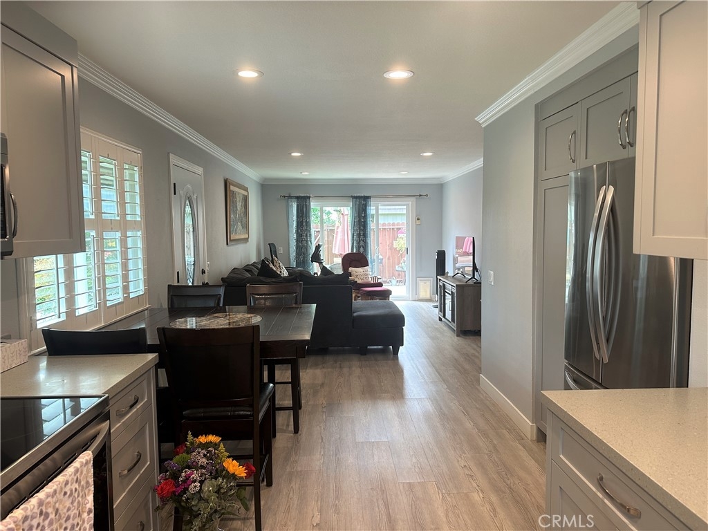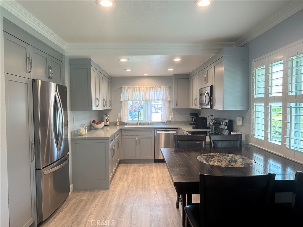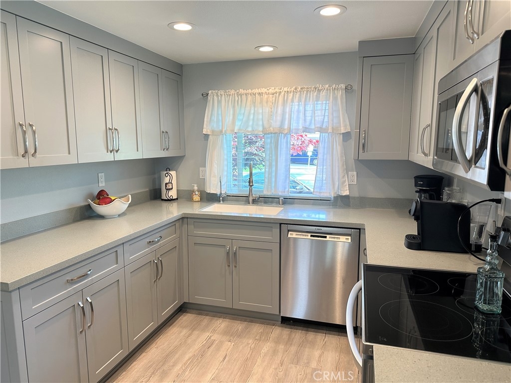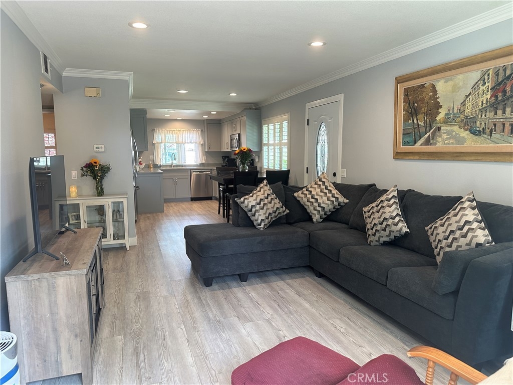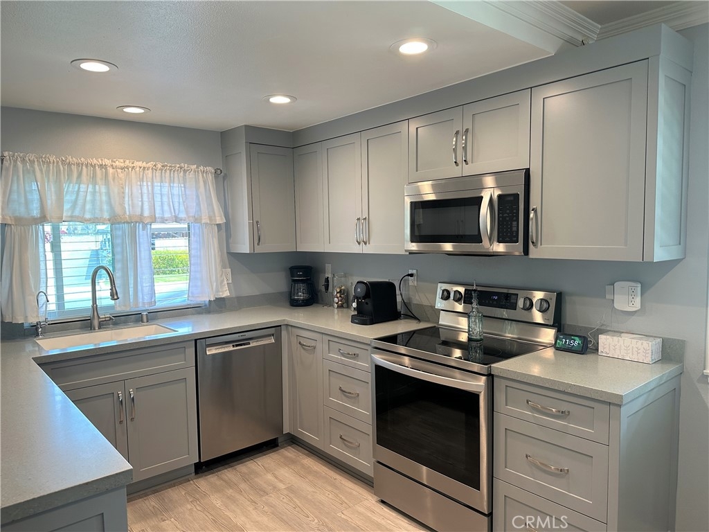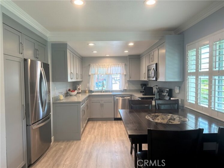 This turnkey, light and bright single-story condo has been extensively remodeled and features various recent upgrades such as air conditioning, vinyl tile flooring, scraped ceilings, custom paint, crown molding and baseboard. The home also has solar energy panels that will be paid in full by the seller, which will save the buyers thousands of dollars per year on their energy bill. The kitchen has been updated with newer granite counters, cabinets, pantry, under sink reverse osmosis, electric LG oven, LG stovetop and a Bosch dishwasher. The bathroom has also been remodeled with a step-in tile shower and the home has newer double-pane windows, dual pane sliding door, newer added recessed lighting, blinds, and plantation shutters. Maytag electric washer and dryer are included and are stored in the patio enclosure area. Newer front door and security screen door. The patio area has electrical outlets and a newer fence. 2 covered carports! Attic storage! The home is in the prestigious Cypress school district and is close to ideal shopping. Light and bright! Beautiful greenbelt landscaping surrounds! The Association has 2 clubhouses, 3 pools and 2 playgrounds. Do not miss this rare opportunity!